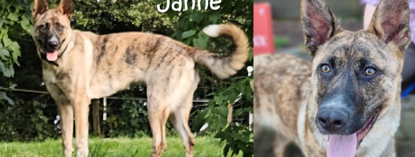 Janne ist eine richtig tolle junge Hündin und dennoch ist sie nach gerade 4 Wochen im Zuhause wieder zurück…. Auf ihrer vorherigen Pflegestelle zeigte sie sich mit ihr bekannten Personen sehr menschenbezogen und kuschelig. Janne ist mit Hunden nach einer vernünftigen Zusammenführung meist verträglich. Sie kennt Katzen, jagt sie aber manchmal, wenn sie Gelegenheit dazu bekommt. Im Spiel mit ihr bekannten Hunden ist Janne ausgelassen und körperbetont. Korrekturen vom Menschen und auch von den souveränen Hunden, werden gut angenommen. Janne war zu Beginn nach ihrer Ankunft in Deutschland sehr unsicher und schnell erregbar in Situationen, die ihr unbekannt waren. Auf Außen-Reize, wie Autos, Fahrradfahrer, Kinder, andere Hunde reagierte sie mit Bellen, Knurren und in die Leine springen. Sie hatte in den letzten Wochen in der Pflegestelle große Fortschritte gemacht. Leider ist sie nun wieder etwas zurückgefallen….Durch Führung und Übungen kann man mit ihr Reize wie Autos oder Fahrradfahrer aber trainieren. Im Auto mitfahren klappt gut. Janne genießt das Kuscheln mit ihren Menschen und auch neue Besucher werden zurückhaltend, aber freundlich hereingelassen. Trotz ihrer manchmal überschäumenden Energie kommt Janne mittlerweile auch gut zur Ruhe und kann sich in der Wohnung gut entspannen. Nur so ganz alleine bleiben, das findet Janne noch nicht so toll. Für Janne suchen wir aktive Menschen, die sie körperlich fordern, aber auch genügend Zeit und vor allem Lust haben weiter mit ihr zu arbeiten und zu üben, und dass auch für die nächsten Jahre! Janne sucht ein eher ruhiges Zuhause. Ein ruhiger souveräner Rüde ihrer Größe würde ihr bestimmt gut tun. Sie braucht Struktur, vertraute Rituale und Grenzen um zur Ruhe zu kommen und Menschen, die sich nicht von ihrer Energie und Unruhe anstecken lassen. Ihre Leute sollten hundeerfahren sein und Spaß daran haben mit ihr zu trainieren. Denn Janne will lernen und gefallen! Sie ist sehr kooperativ, liebt lange Spaziergänge und hätte sicherlich auch Freude an Nasenarbeit, Tricks o.ä.