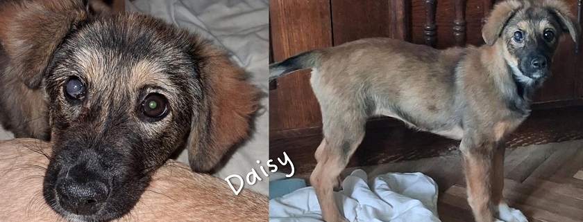 Daisy hatte als kleiner Welpe, als sie gefunden wurden, eine schlimme Augenentzündung und der Tierarzt versuchte das Auge zu retten. Zweimal wurde sie operiert, die Entzündung ist abgeklungen, aber leider wird sie auf diesem Auge vermutlich blind bleiben. Während dieser ganzen Zeit der Behandlung durfte sie bei Gabriela zu Hause wohnen. Nun ist es Zeit, dass auch Daisy ihr Glück versucht. Daisy ist wie auch ihre Schwestern superfreundlich und kennt den Kontakt zu anderen Hunden. Wir wünschen uns für Daisy verantwortungsbewusste Menschen, die ihr Zeit, Geduld und Liebe schenken und sich bewusst sind, dass ein Hund ein treuer Begleiter für das ganze Leben ist. Natürlich muss die junge Hündin das 1×1 der Hundeschule noch lernen, wie z.B. Leinenführigkeit und Stubenreinheit. Doch mit Geduld und konsequenter Führung wird sie schnell verstehen was man von ihr erwartet. Wie groß Daisy ausgewachsen einmal sein wird können wir nicht genau sagen, vermuten aber, dass sie eine mittlere Größe erreichen wird (40-50 cm).